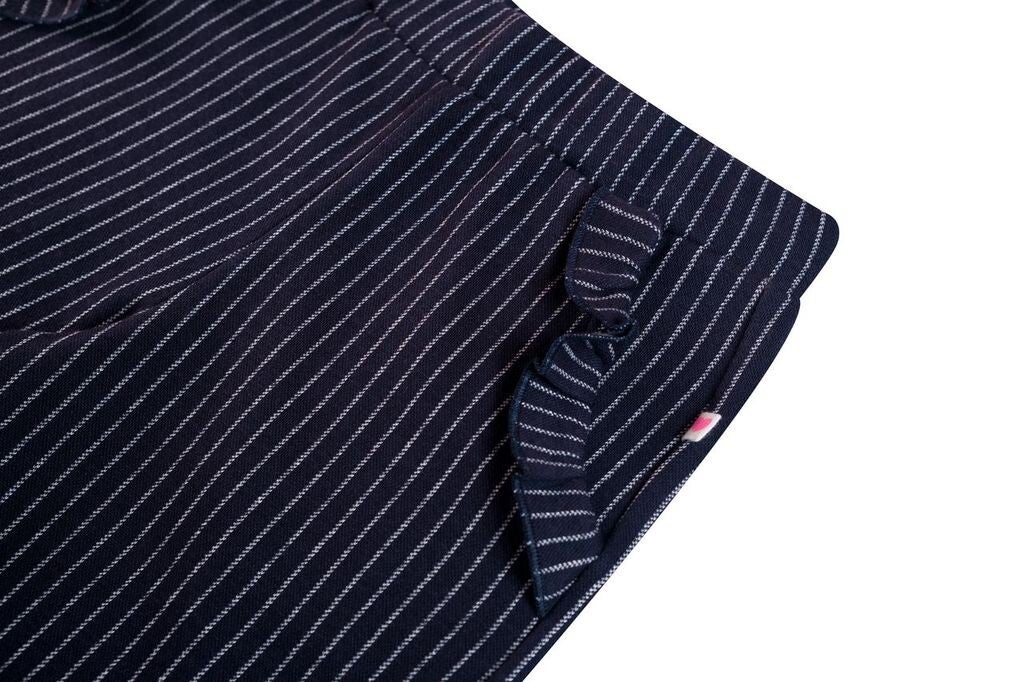 Donkerblauwe broek met ecru streep. Ruches aan de zakken als mooi detail.