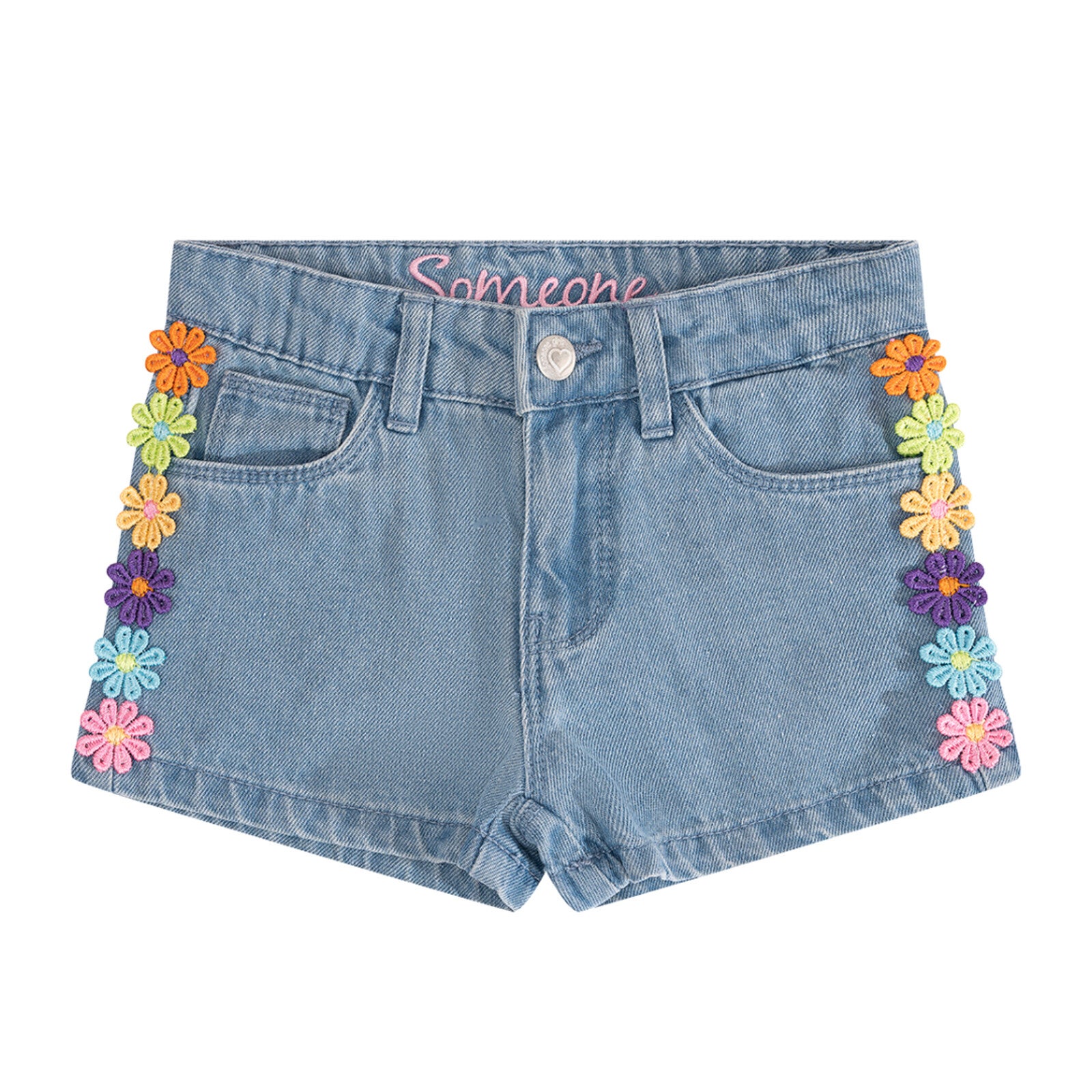 Jeansshortje met bloemendetails aan de zijkant.