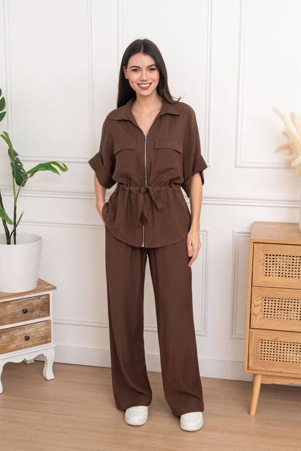 Mooie blouse met korte mouwen waarvan je de taille kan accentueren met het koordje.